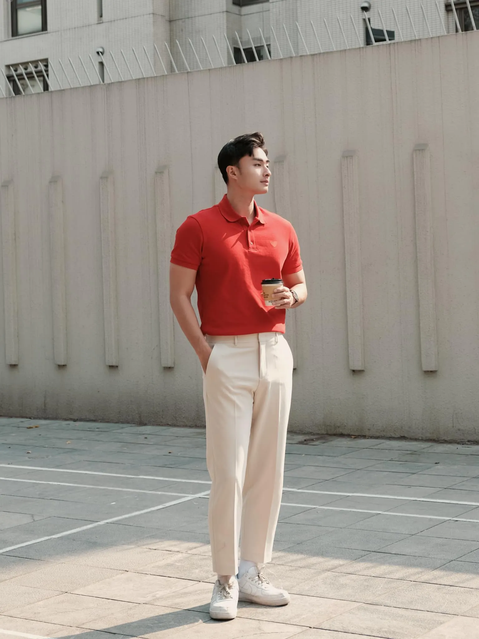 Áo polo màu đỏ kết hợp với quần dài trắng và giày thể thao trắng, rất phù hợp với mệnh Thổ, tạo nên một bộ đồ nổi bật và đầy năng lượng (Nguồn: Routine)