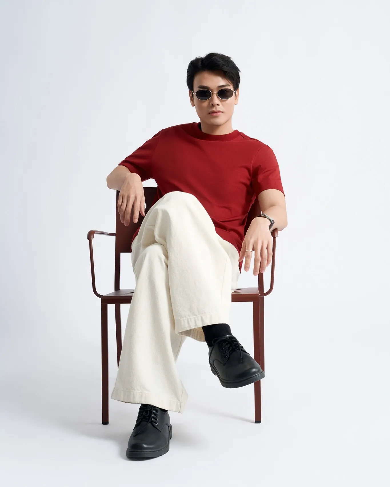 Áo thun đỏ và quần ống rộng màu trắng tạo sự hài hòa và nhẹ nhàng, thích hợp cho nam giới mệnh Thổ (Nguồn: Routine)