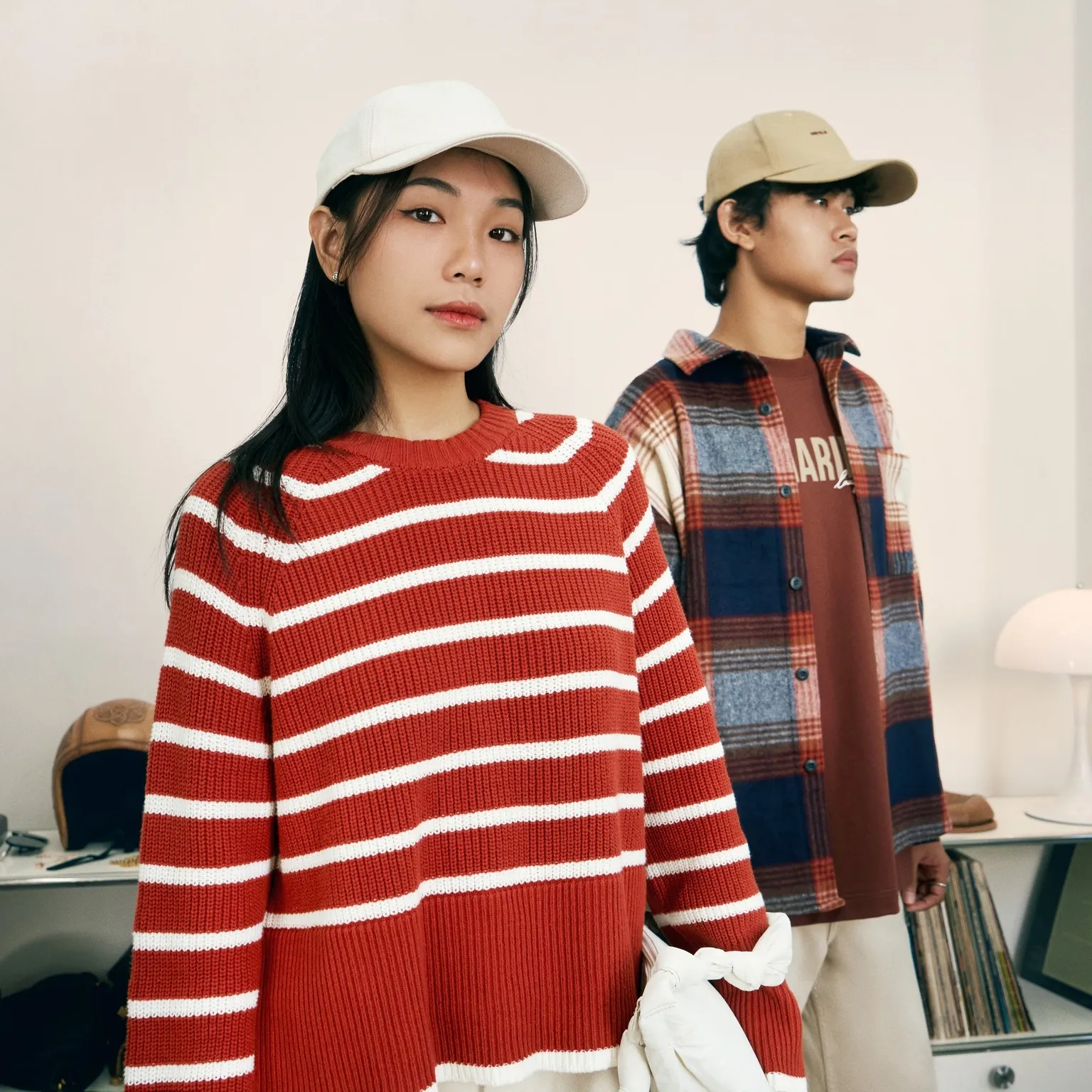 Áo len đỏ với các sọc trắng và áo khoác kẻ sọc kết hợp với áo thun nâu kết hợp hài hòa, tạo cảm giác trẻ trung, nổi bật, thu hút mọi ánh nhìn (Nguồn: Routine)